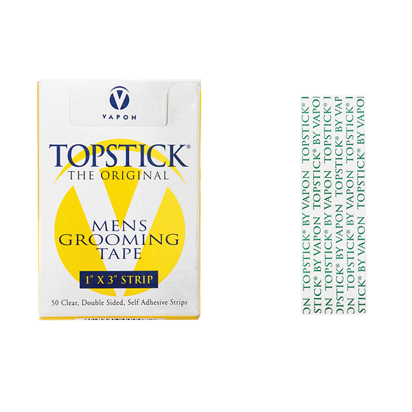 TOPSTICK® a clear, double-sided, medical adhesive tape in strips, used to hold hairpieces to the scalp. Hypo-allergenic, waterproof, high quality tape does not separate when removed. The back liner is slit for easy opening. Apply tape to the tape tab or perimeter of hairpiece. Can be applied to the entire hairpiece interior for a secure hold