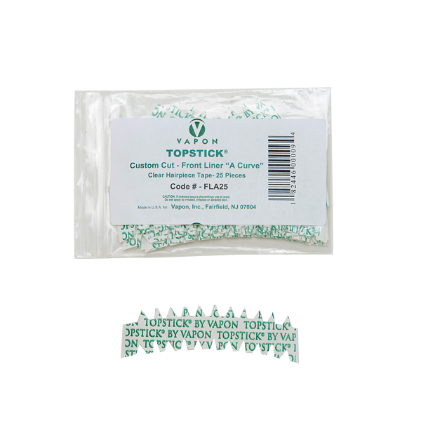 TOPSTICK® Front Liner – An amazing new hairpiece tape that makes the front edge of a hairpiece “disappear.” Hides the leading edge of the hairpiece. The points (serrated edge) are designed to extend slightly over the front edge of the hairpiece. The hair is then combed and pressed down onto the points to give a natural, blended look even in the wind. TOPSOL Solvent should be used to soften the points and release the hair before removing the hairpiece to prevent damage to hair on the front of the hairpiece.